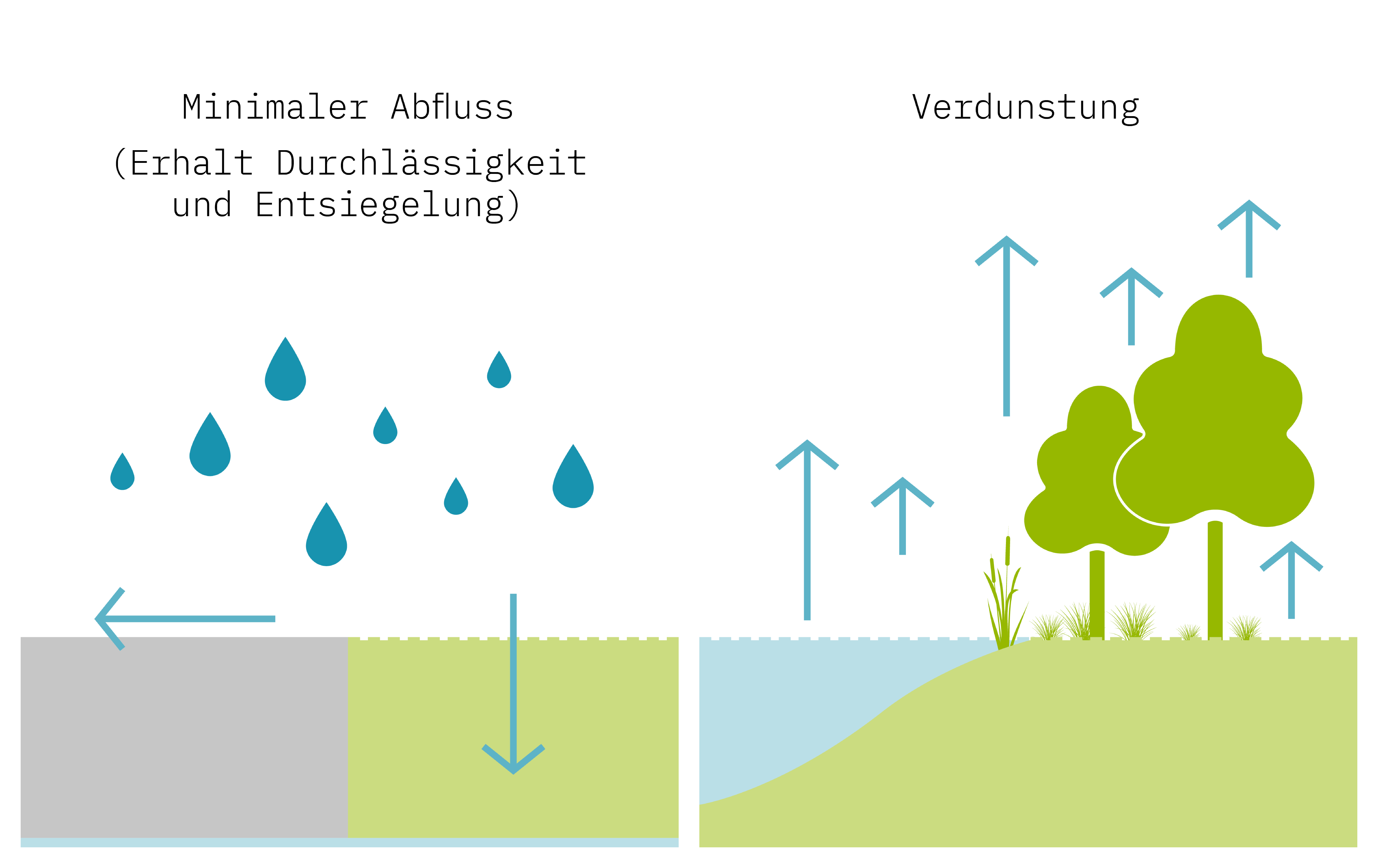 Schwammstadt-Massnahmen gehen einher mit einer durchlässigen Oberflächengestaltung und geförderter Verdunstungs- und Versickerungsleistung. Der natürliche Wasserhaushalt wird dadurch unterstützt, womit u.a. die Menge an abfliessendem Wasser reduziert wird.