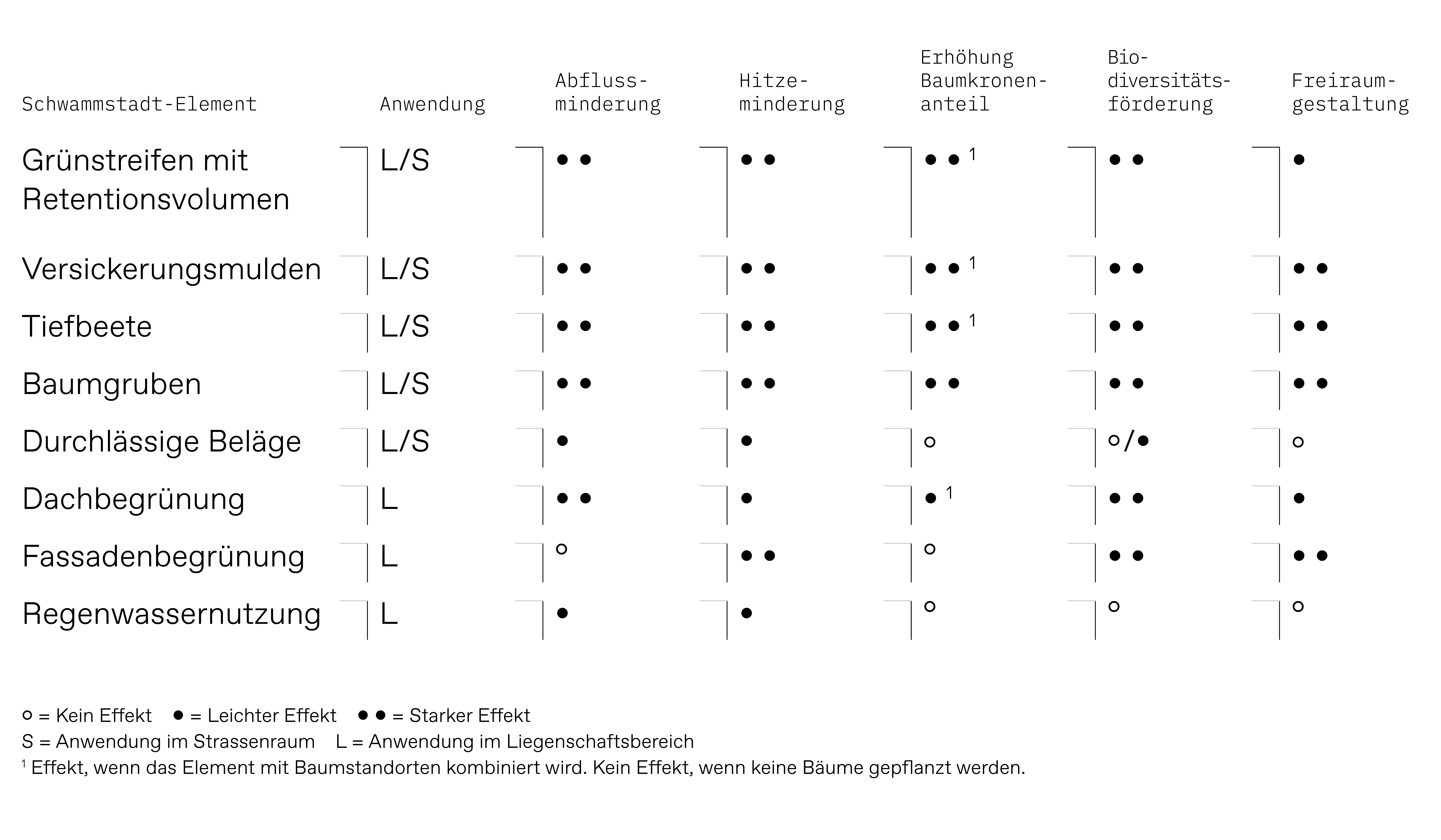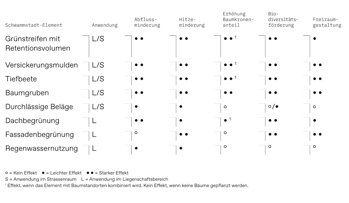 Die nachfolgende Tabelle gibt einen Überblick über mögliche Schwammstadt-Elemente und die qualitative Beurteilung dieser in Bezug zu den Wirkungsfeldern.