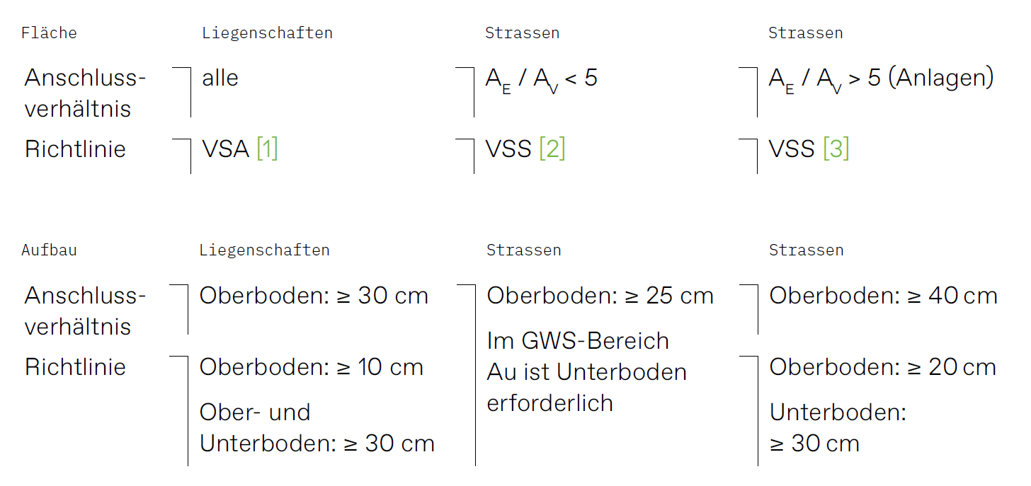 Zu Beginn der Planung ist zu klären, was die Anforderungen an die Versickerung gemäss VSA Richtlinie Abwasserbewirtschaftung (2019) im Liegenschaftsbereich und der VSS-Normen für Strassen sind. Die Anforderungen sind abhängig von den folgenden lokalen Begebenheiten: