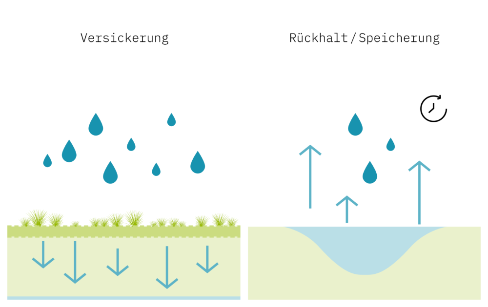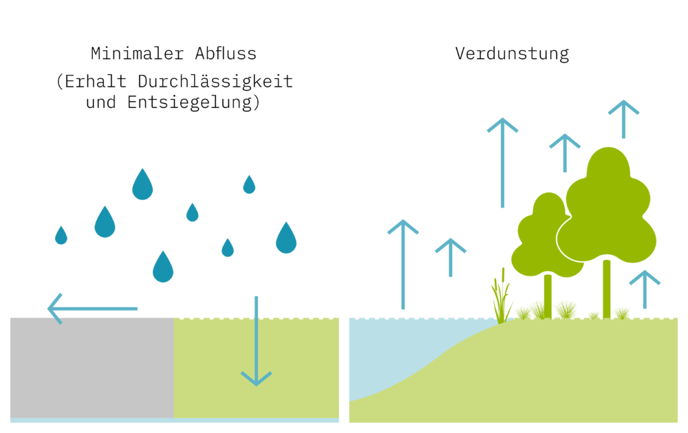 In Kontext der Klimaanpassung kann das Prinzip der «Schwammstadt» oder wassersensiblen Siedlungsentwicklung wichtige Funktionen erfüllen. Das im Siedlungsgebiet anfallende Regenwasser soll aufgefangen, lokal gespeichert und genutzt werden. Die Verdunstung und die Versickerung sollen der direkten Ableitung vorgezogen werden, wodurch der natürliche, lokale Wasserkreislauf unterstützt wird.