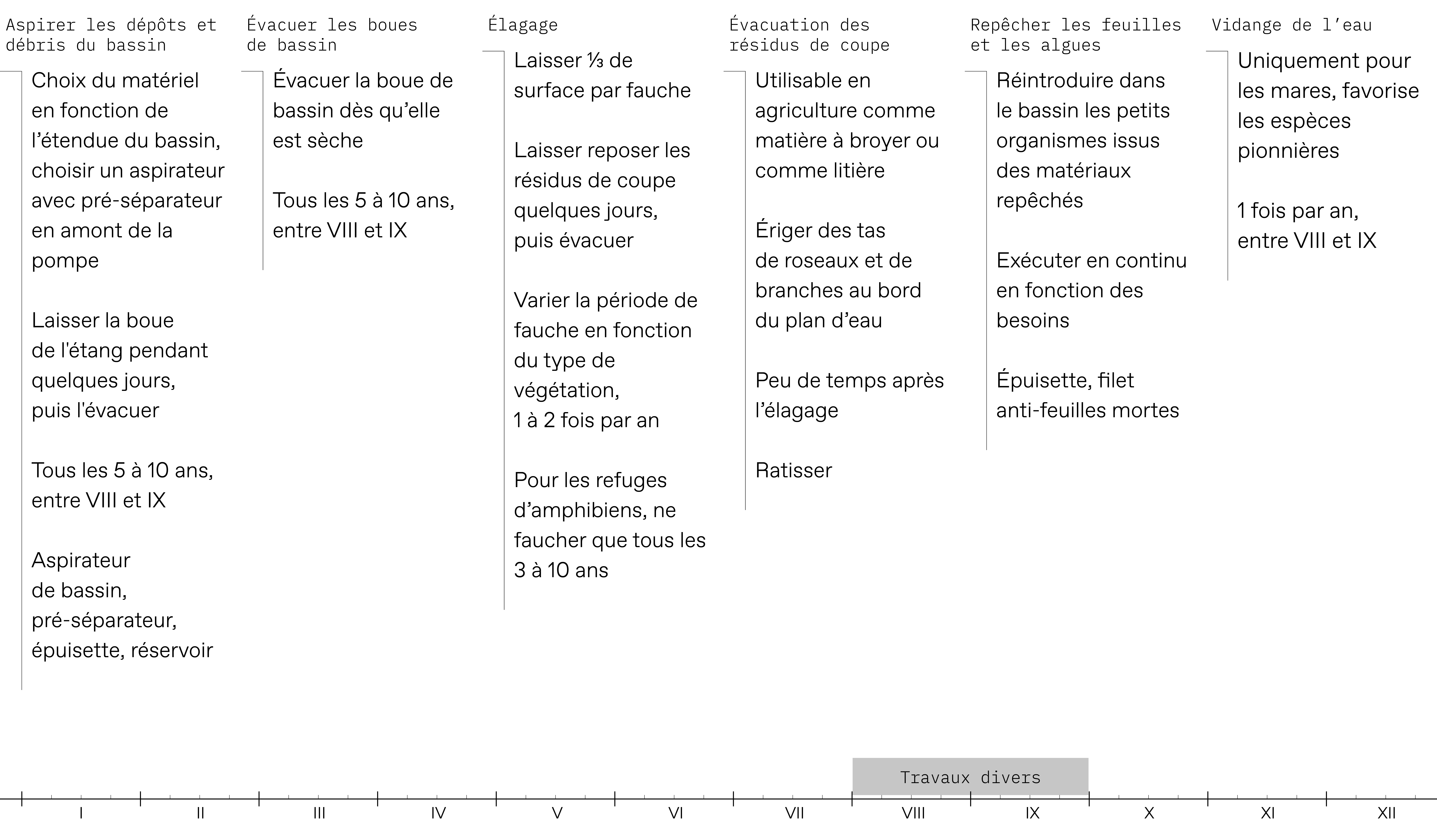 Prinzipiell eignen sich für eine amphibienschonende Pflege die Monate nach dem Landgang der zu Adulttieren entwickelten Amphibien am besten, also der Zeitraum zwischen Ende September und Anfang November [3]. Zu einem späteren Zeitpunkt werden bereits mögliche Winterquartiere zerstört, wodurch die Lurche der Kälte ausgesetzt werden.