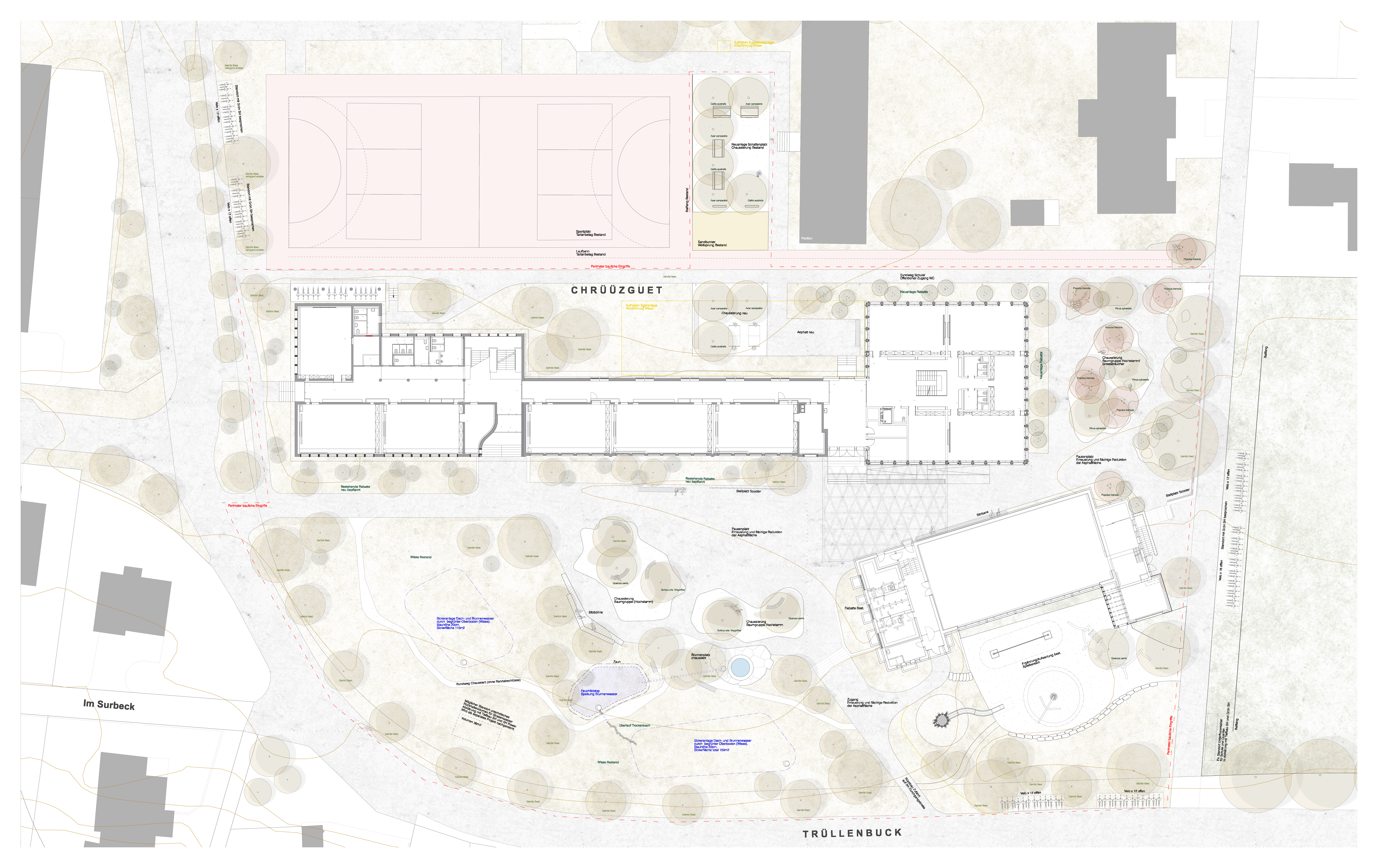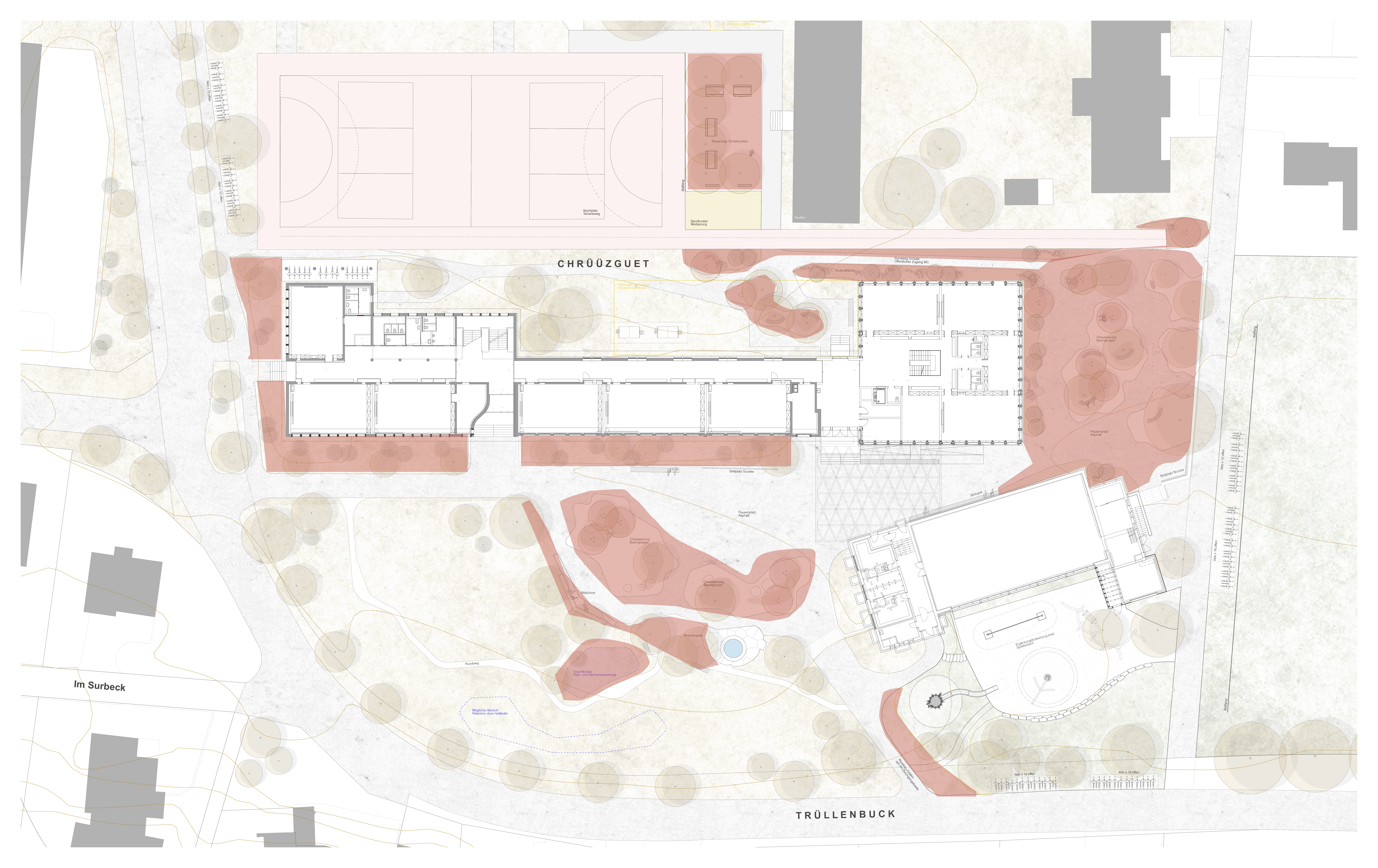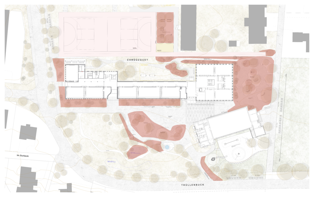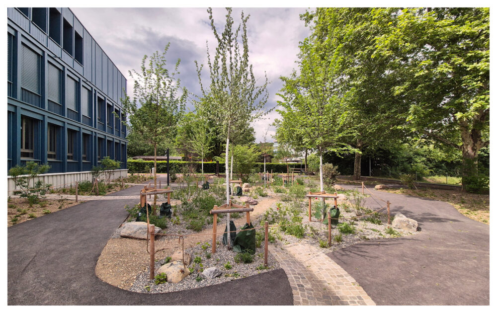 Rund um das Schulhaus wurden Freiräume nach dem Schwammstadt-Prinzip geschaffen und aufgewertet, um das Regenwasser im natürlichen Kreislauf zu belassen. Bauminseln, Versickerungsmulden, ein Feuchtbiotop und bepflanzte Flächen sorgen dafür, dass Regenwasser versickern kann, die Biodiversität gefördert und das Mikroklima verbessert wird. Die neugestalteten Grün- und Freiräume bieten zudem attraktive Aufenthaltsbereiche für Schüler:innen und die Quartierbevölkerung.