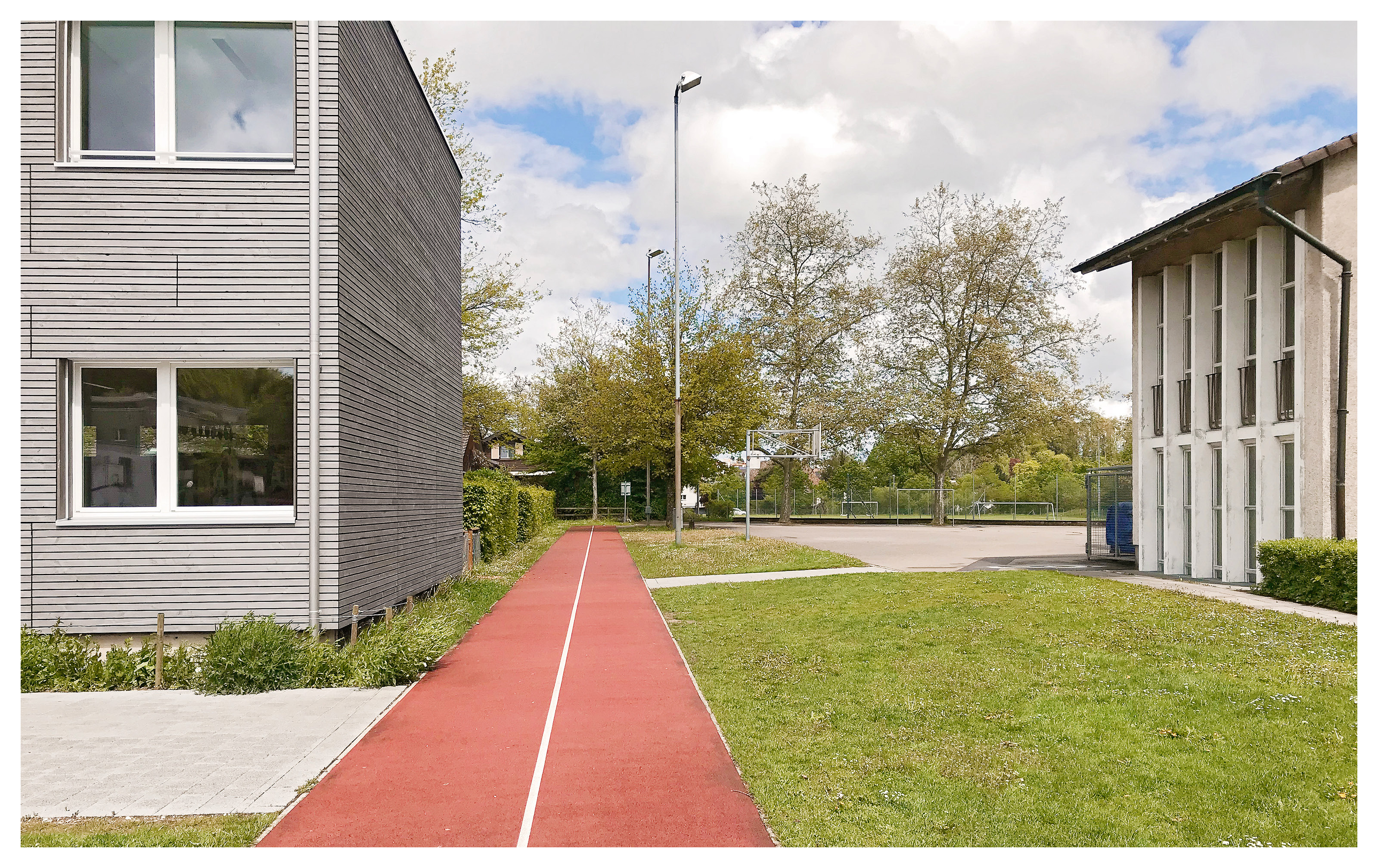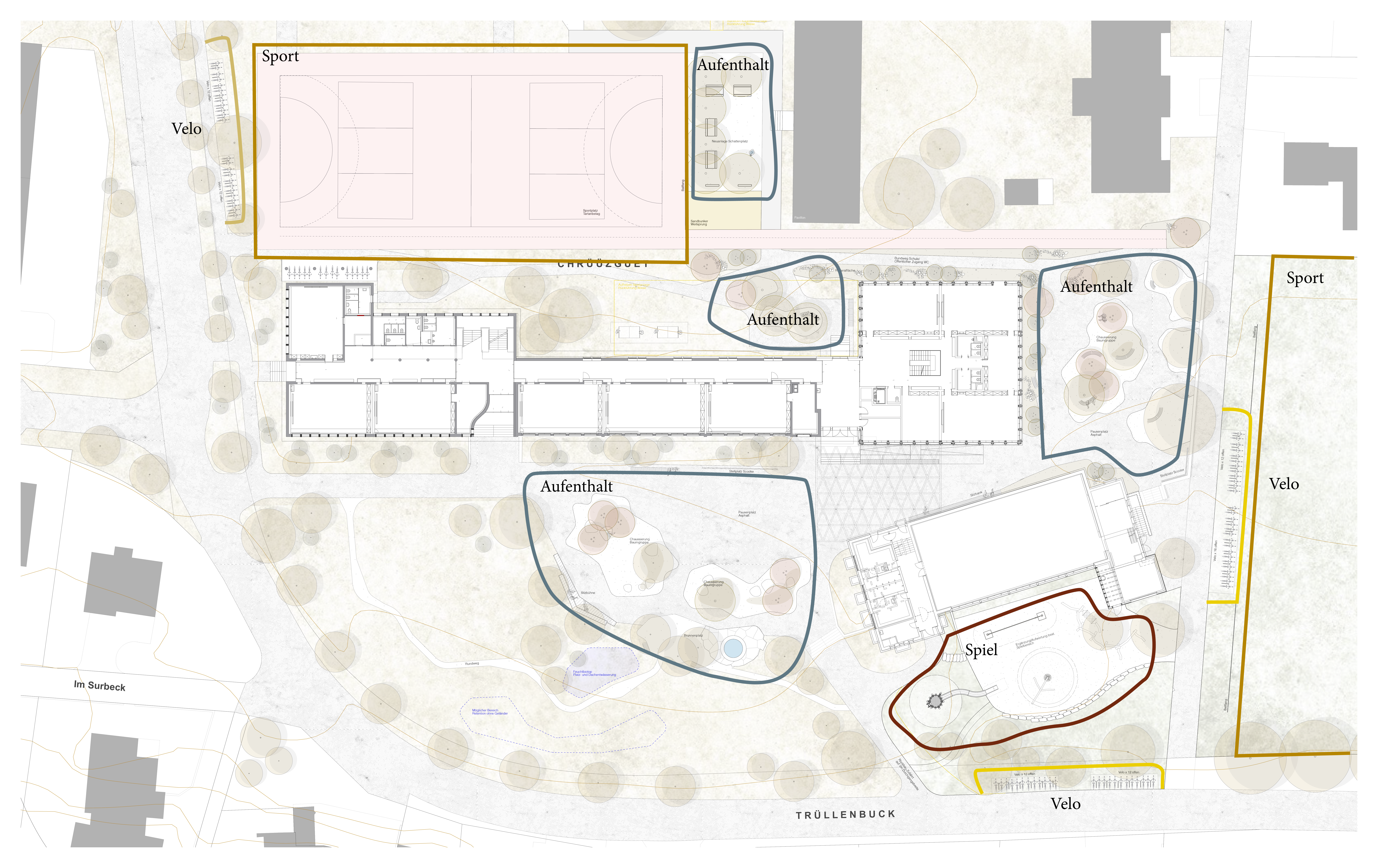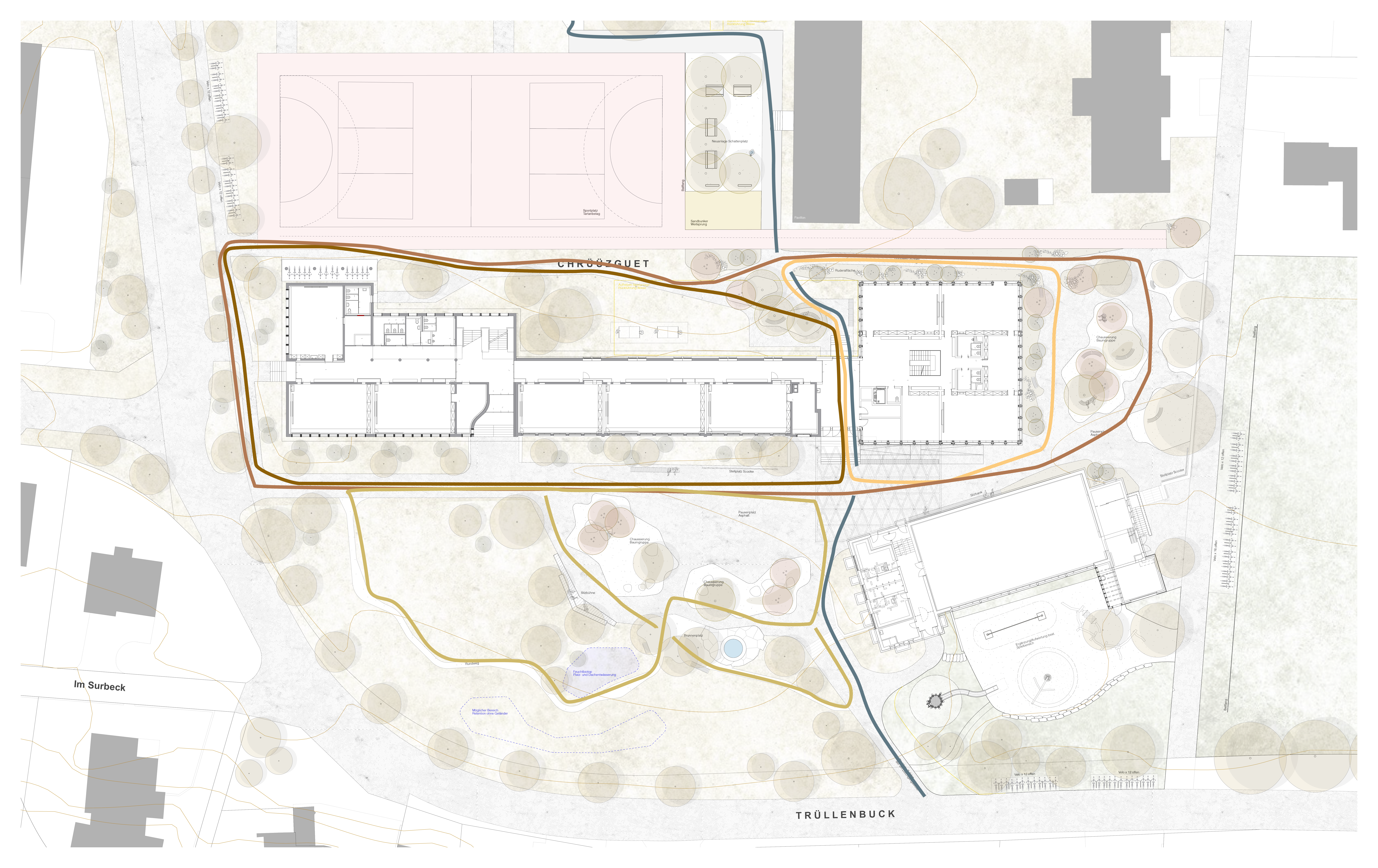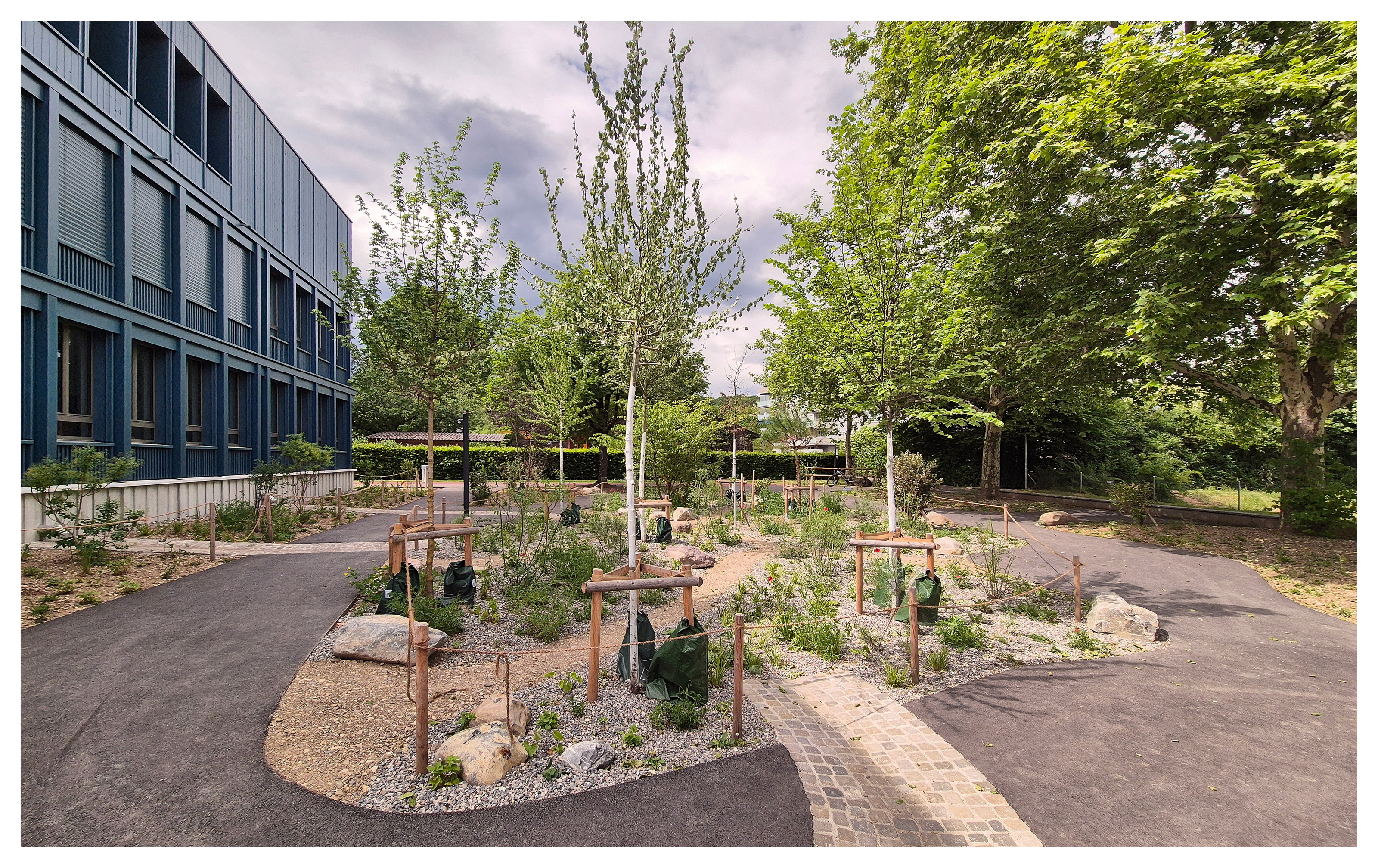 Rund um das Schulhaus wurden Freiräume nach dem Schwammstadt-Prinzip geschaffen und aufgewertet, um das Regenwasser im natürlichen Kreislauf zu belassen. Bauminseln, Versickerungsmulden, ein Feuchtbiotop und bepflanzte Flächen sorgen dafür, dass Regenwasser versickern kann, die Biodiversität gefördert und das Mikroklima verbessert wird. Die neugestalteten Grün- und Freiräume bieten zudem attraktive Aufenthaltsbereiche für Schüler:innen und die Quartierbevölkerung.