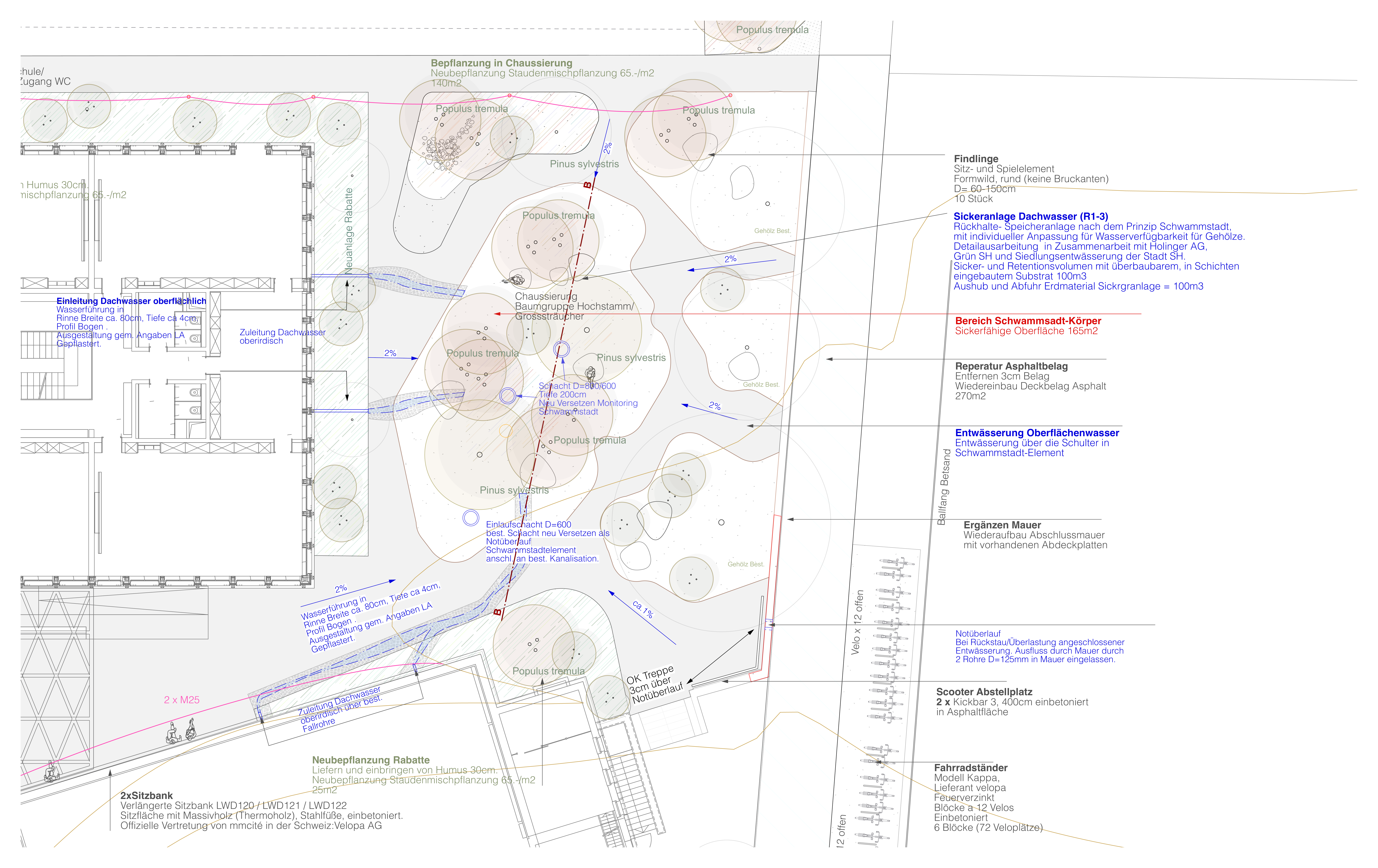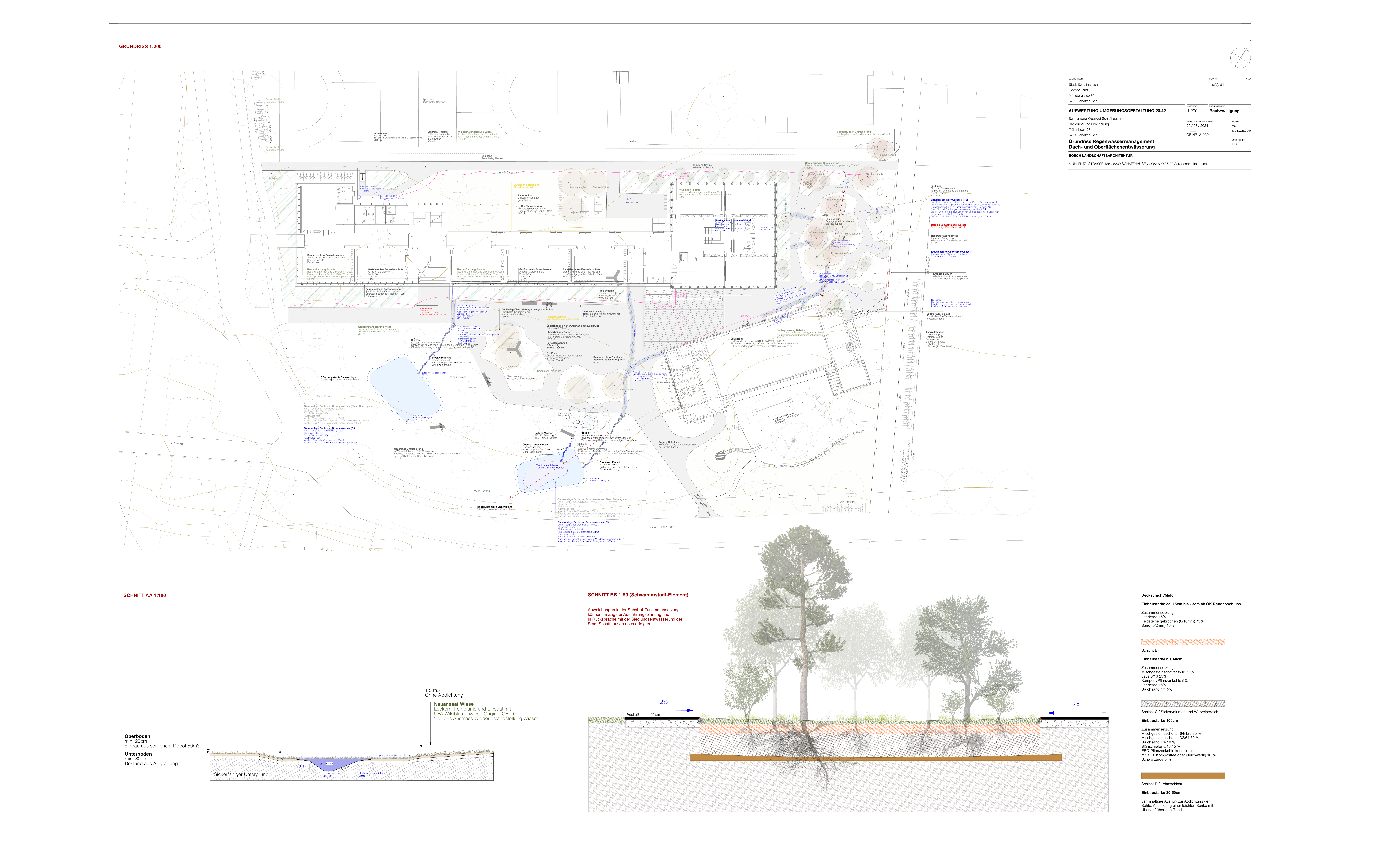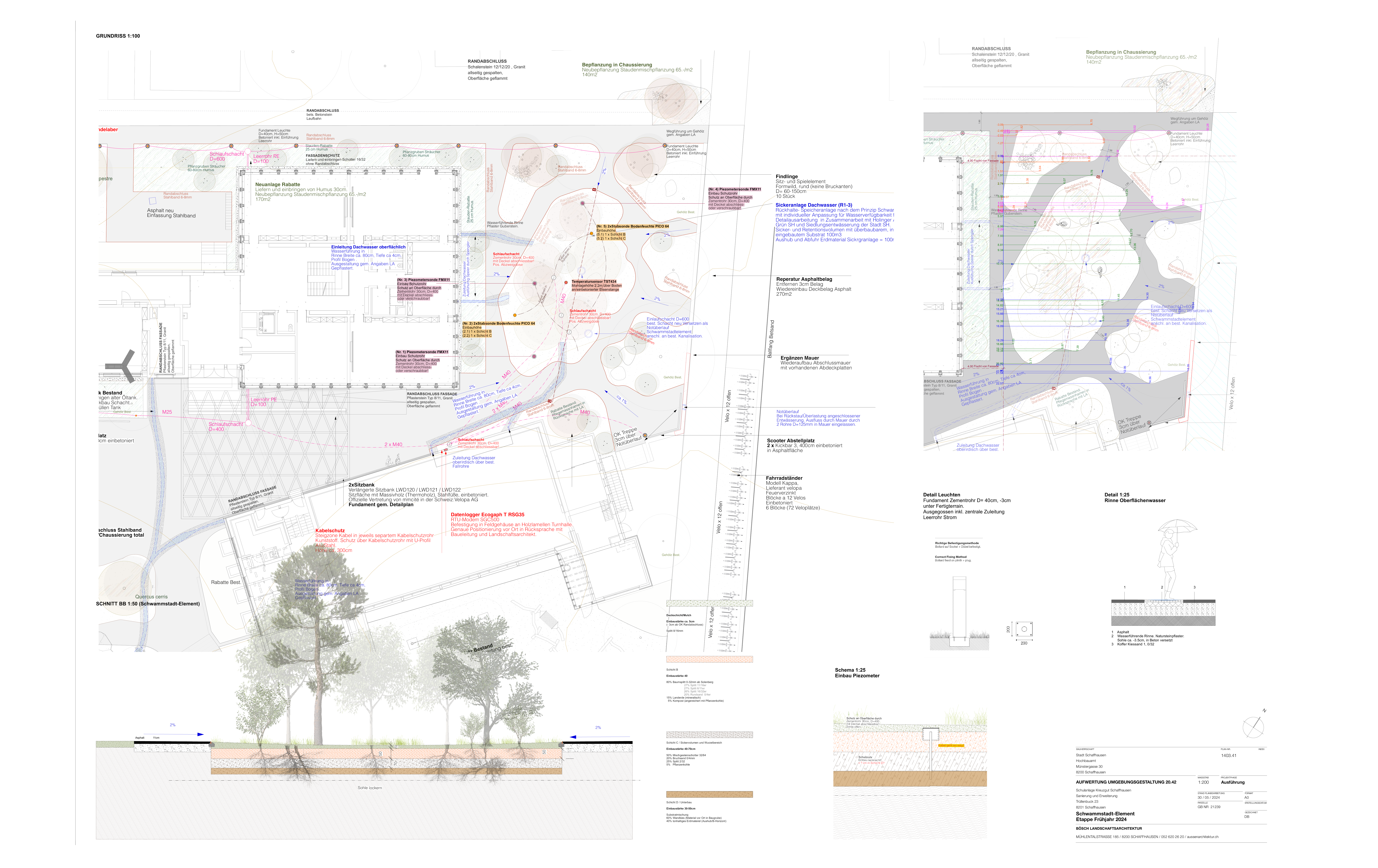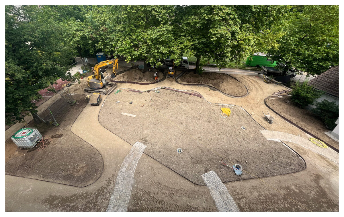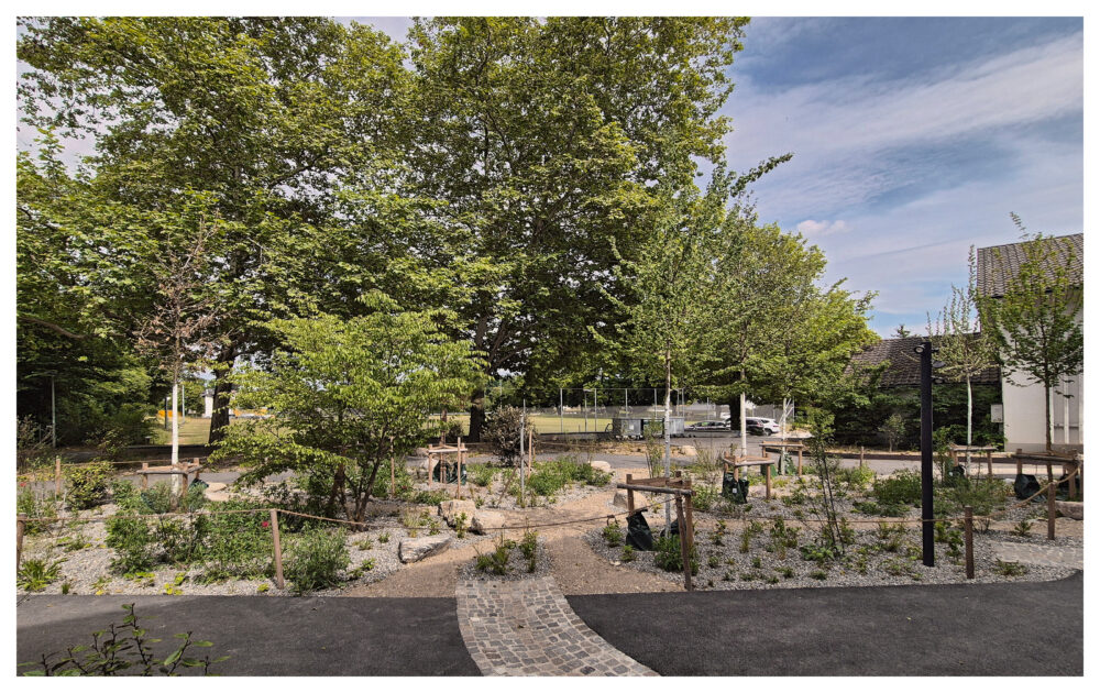 Die Realisierung des Schwammstadtprojekts (Bereich 1) erfolgte von August bis Dezember 2024, die Unterbepflanzung/Staudenschicht im April 2025 unter der gestalterischen sowie technischen Bauleitung durch Bösch Landschaftsarchitektur.