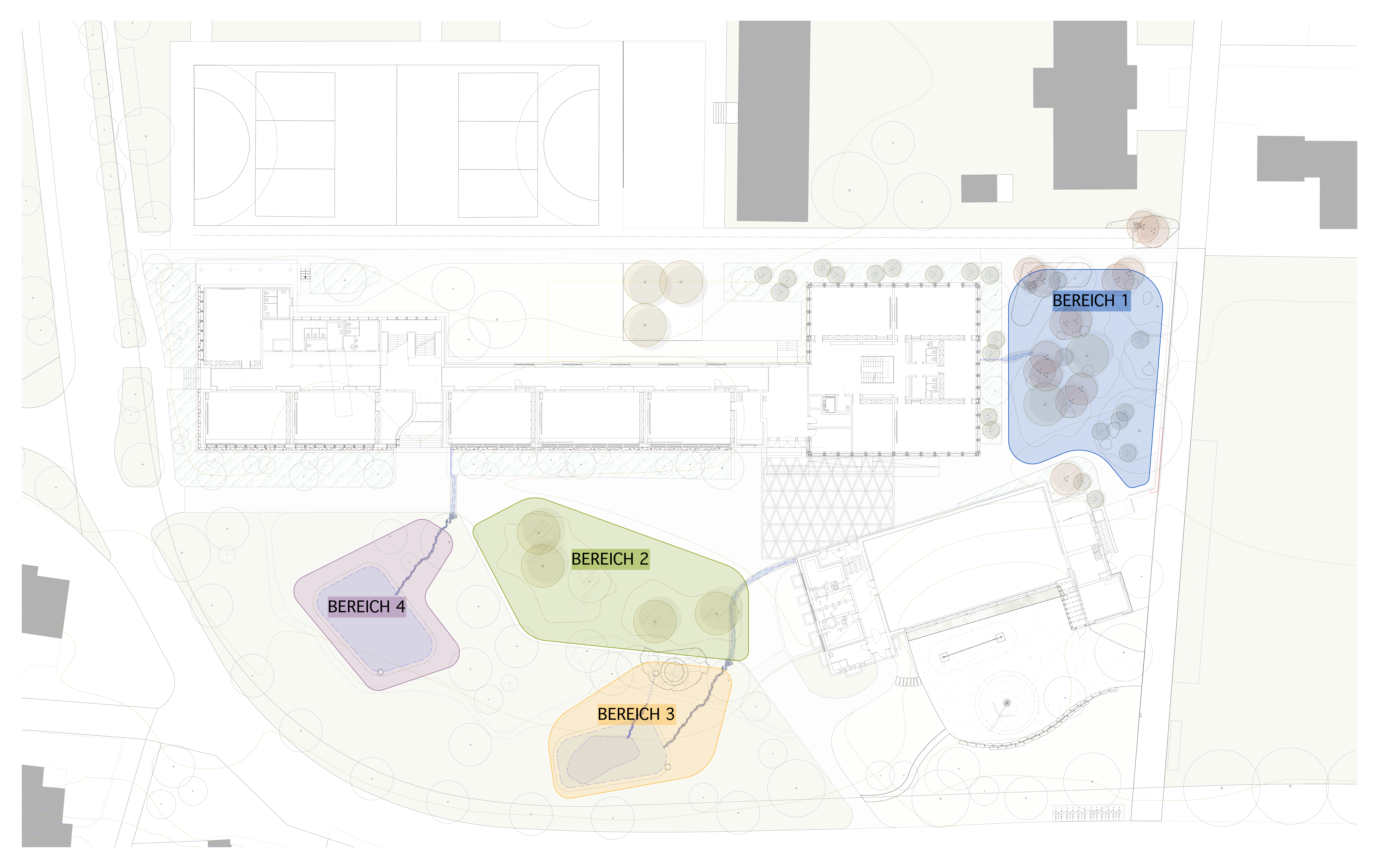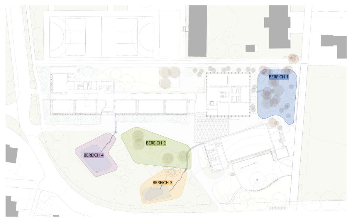 Die Planung und Realisierung der Grün- und Freiräume auf dem Areal des Schulhauses Kreuzgut wurde in vier Bereiche aufgeteilt. In dieser Dokumentation wird insbesondere Bereich 1 näher betrachtet.