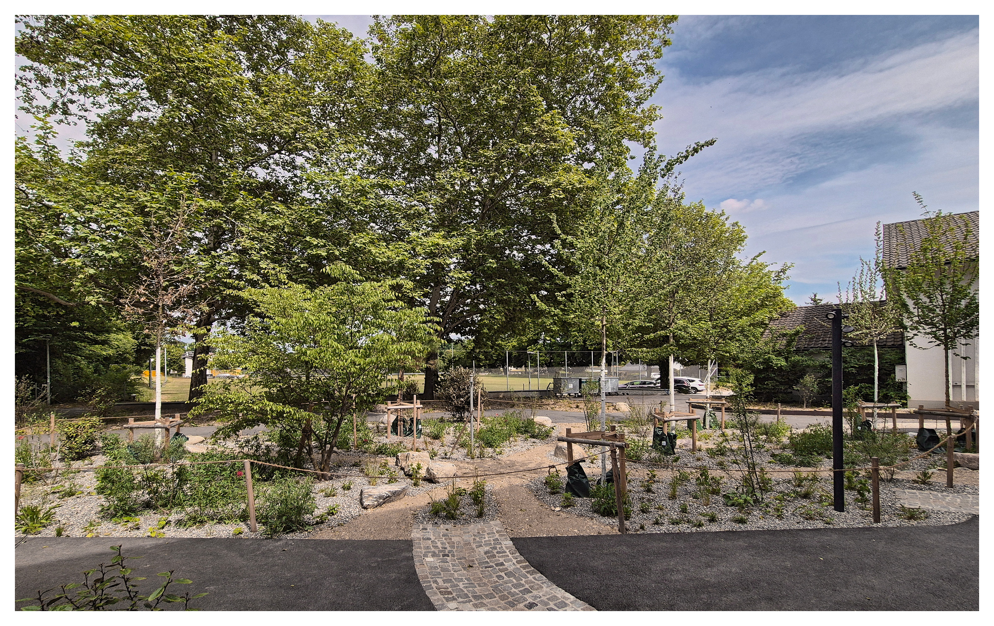 Bestehende Bäume wurden während der Bauarbeiten durch Absperrungen vor mechanischer Beschädigung geschützt.