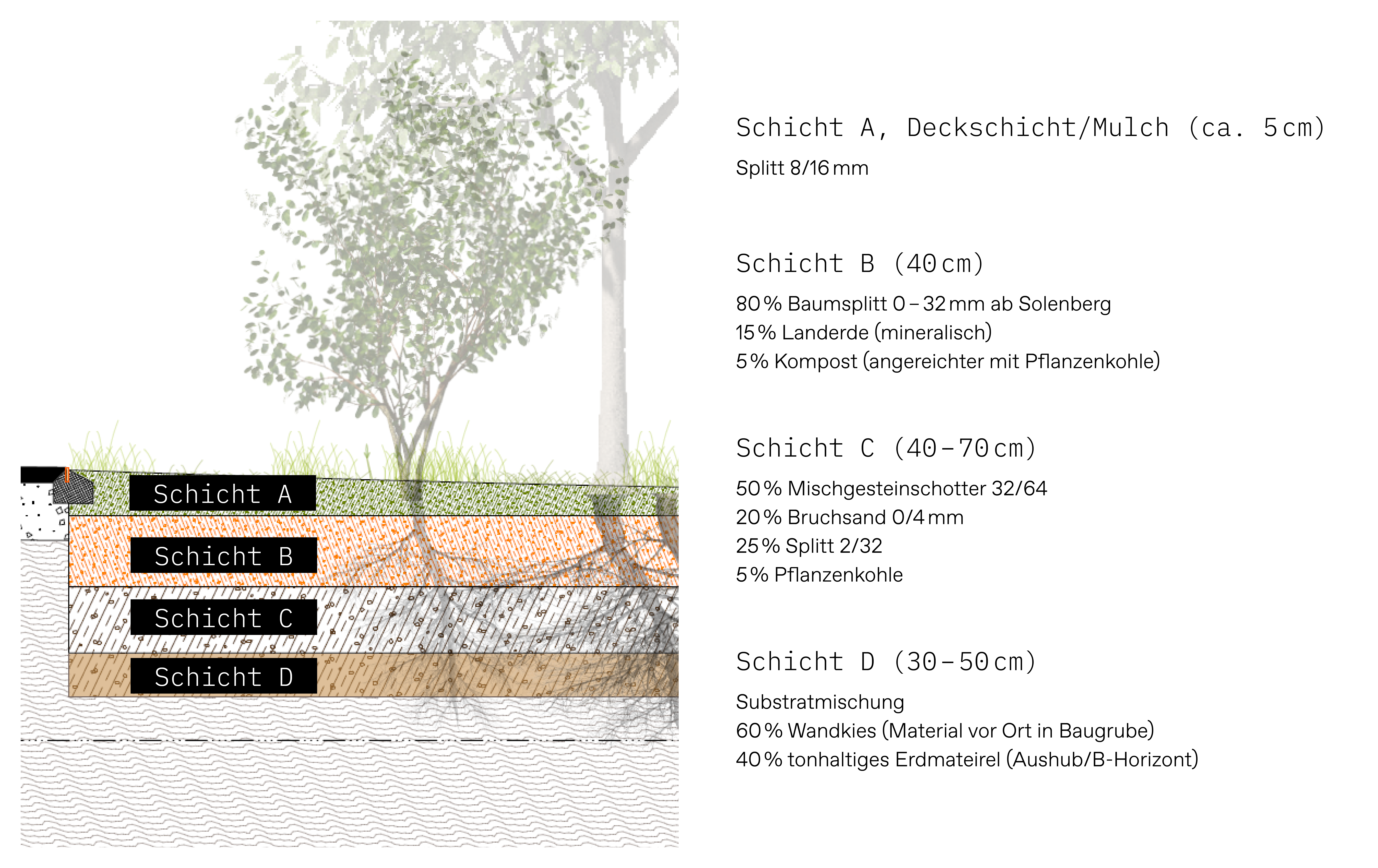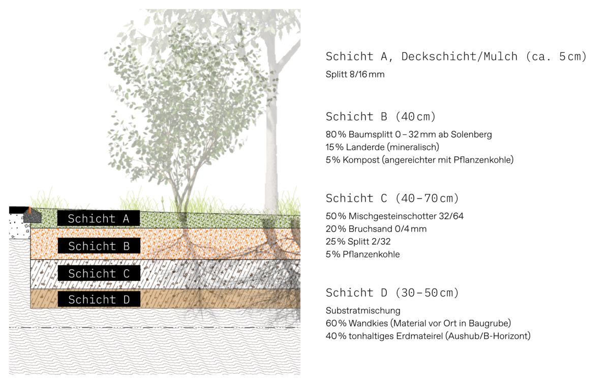 Da stehendes Wasser jedoch vermieden werden sollte und eine vertikale Zirkulation des Wassers wichtig ist – unter anderem für die Pflanzenwurzeln – wurde in Rücksprache mit verschiedenen Expert:innen eine Alternative gewählt: Der untersten Substratschicht wird tonhaltiges Material beigemischt. Dieses hält das Wasser teilweise zurück, ohne die Zirkulation zu unterbrechen. Diese Entscheidung beeinflusst nicht nur den Wasserhaushalt an sich, sondern auch die Wahl geeigneter Pflanzen.