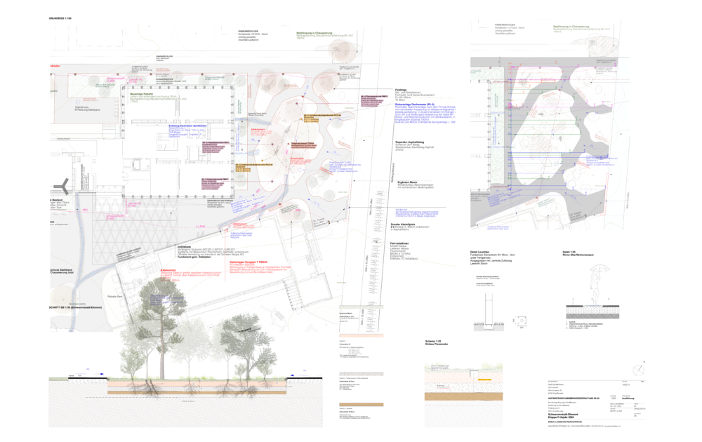 Im weiteren Planungsprozess und bei der Realisierung stellte der Aufbau des Schwammstadt-Elements eine besondere Herausforderung dar, da keine vergleichbaren Referenzen vorlagen und viele Details im offenen, teilweise experimentellen Prozess entwickelt werden mussten.