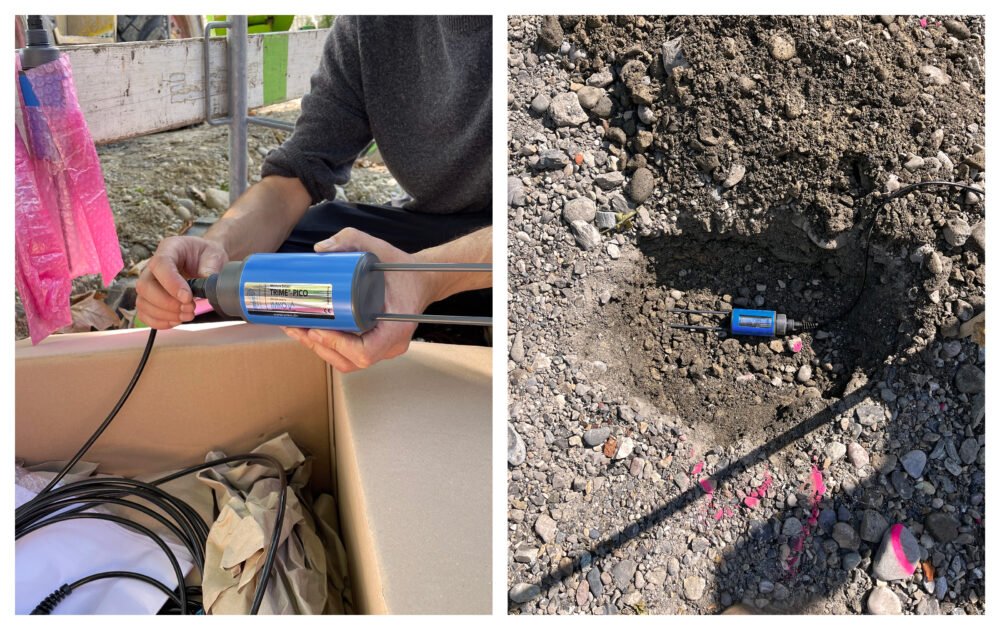 Im Sommer 2025 wurden zusätzlich vier Temperatursensoren installiert. Dadurch können Bodenfeuchtedaten künftig in einen klimatischen Kontext eingebettet sowie mikroklimatische Auswirkungen der Schwammstadt-Massnahmen quantifiziert werden. Zudem ist angedacht, die Fläche im nordöstlichen Teil des Areals (Bereich 1) durch Saftflussmessungen an drei Baumarten zu ergänzen. Dies liefert Informationen zur Verdunstungsleistung der Bäume und ermöglicht in Kombination mit Bodenfeuchte- und Klimadaten Rückschlüsse auf die Ursachen bei reduzierter Verdunstung. Dadurch wird eine präzisere Beurteilung des Wasserhaushalts der Fläche und ihrer mikroklimatischen Wirkungen möglich.