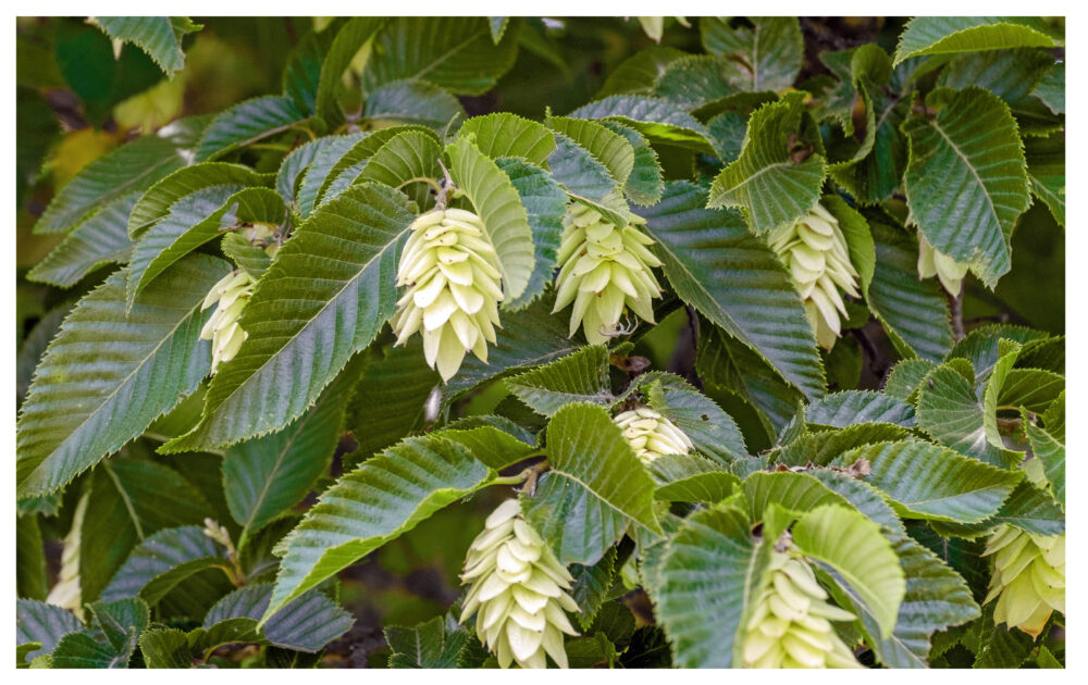 Zelkove (Zelkova serrata), Espe (Populus tremula), Grauerle (Alnus incana), Blutbirke (Betula pendula ‚purpurea‘), Feldahorn (Acer campestre), Zerreiche (Quercus cerris), Steineiche (Quercus ilex), Seekiefer (Pinus pinaster), Europäische Hopfenbuche (Ostrya carpinifolia), Flatter-Ulme (Ulmus laevis)