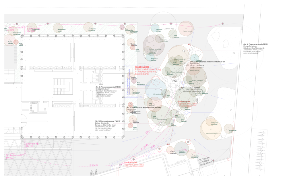 Im Rahmen des Ausführungsprojekts wurde vom Landschaftsarchitekten ein Ausführungsplan erstellt. Dieser dient als detaillierte Anleitung für die Bauausführung. Die ausführenden Personen beziehungsweise Unternehmen benötigen präzise Angaben zu Material, Massen, Details und Einbausituationen, um korrekt bauen zu können. Die Informationen wurden in diesem Prozessschritt definiert und in Form von Plänen festgehalten.