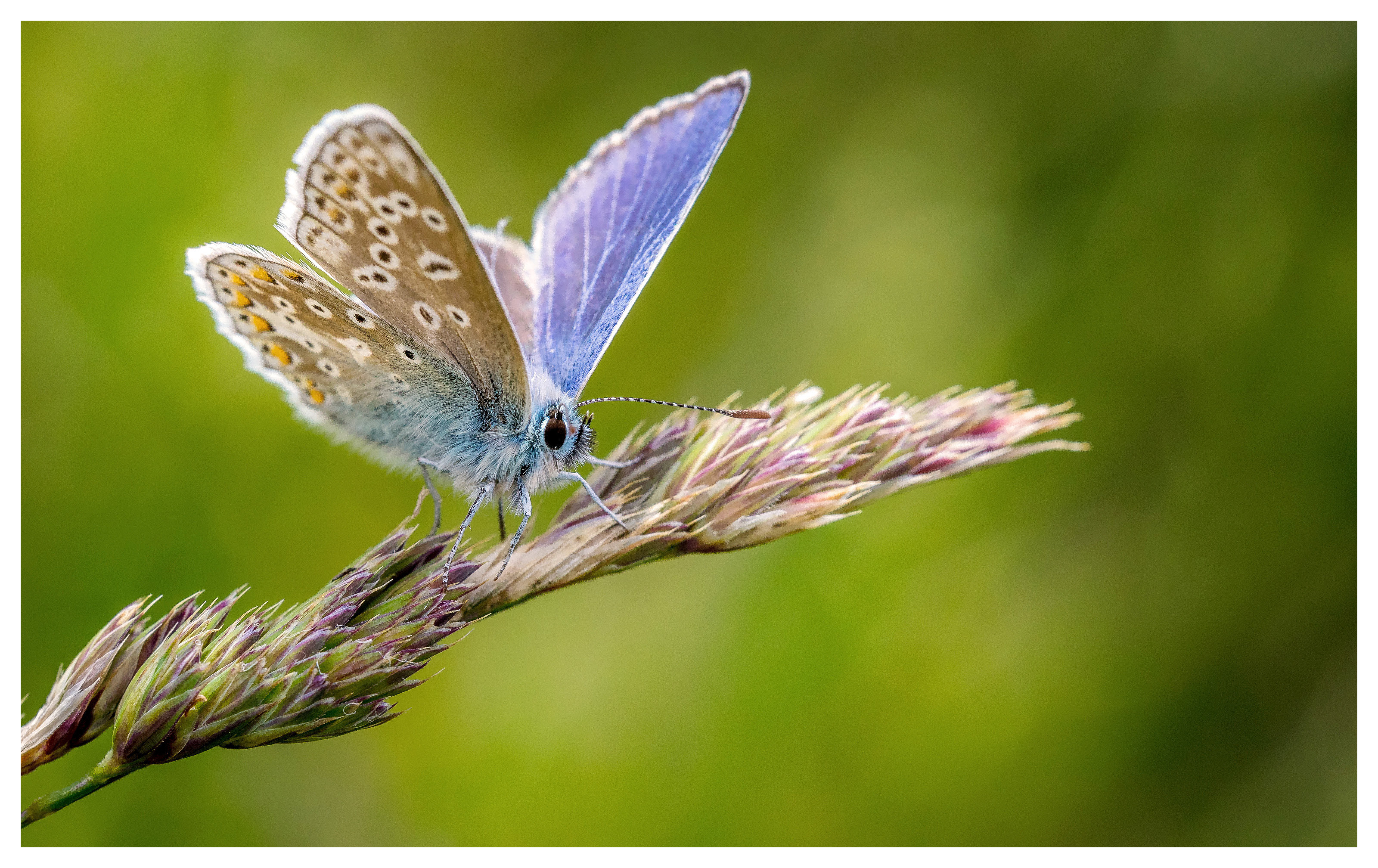 Hauhechelbläuling (Polyommatus icarus), Hainlaufkäfer (Carabus nemoralis), Feld-Sandlaufkäfer (Cicindela campestris), Brauner Grashüpfer (Chorthippus brunneus), Schwarze Wegameise (Lasius niger)