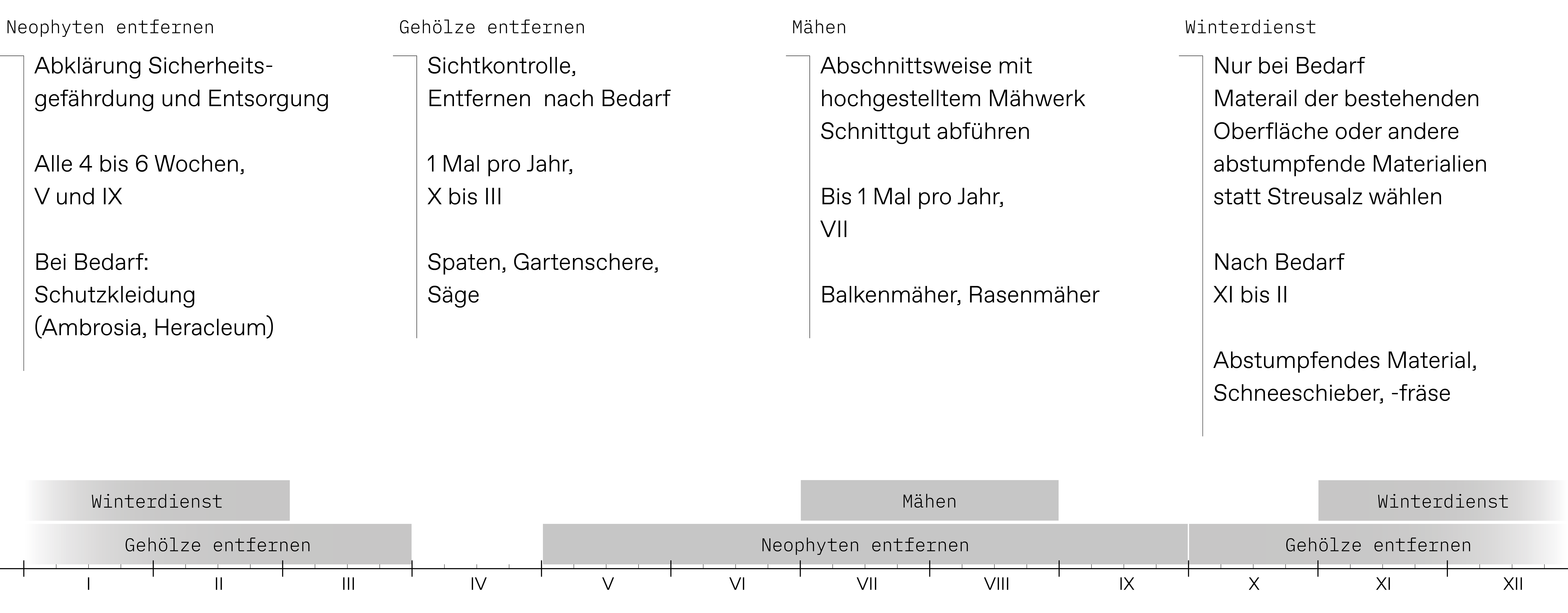 Zur Schneeräumung sind bevorzugt Schneefräsen einzusetzen. Räumschilder müssen so hoch eingestellt sein, dass sie keine Beschädigungen an der Vegetation oder insbesondere der Vegetationstragschicht verursachen. [2][6]