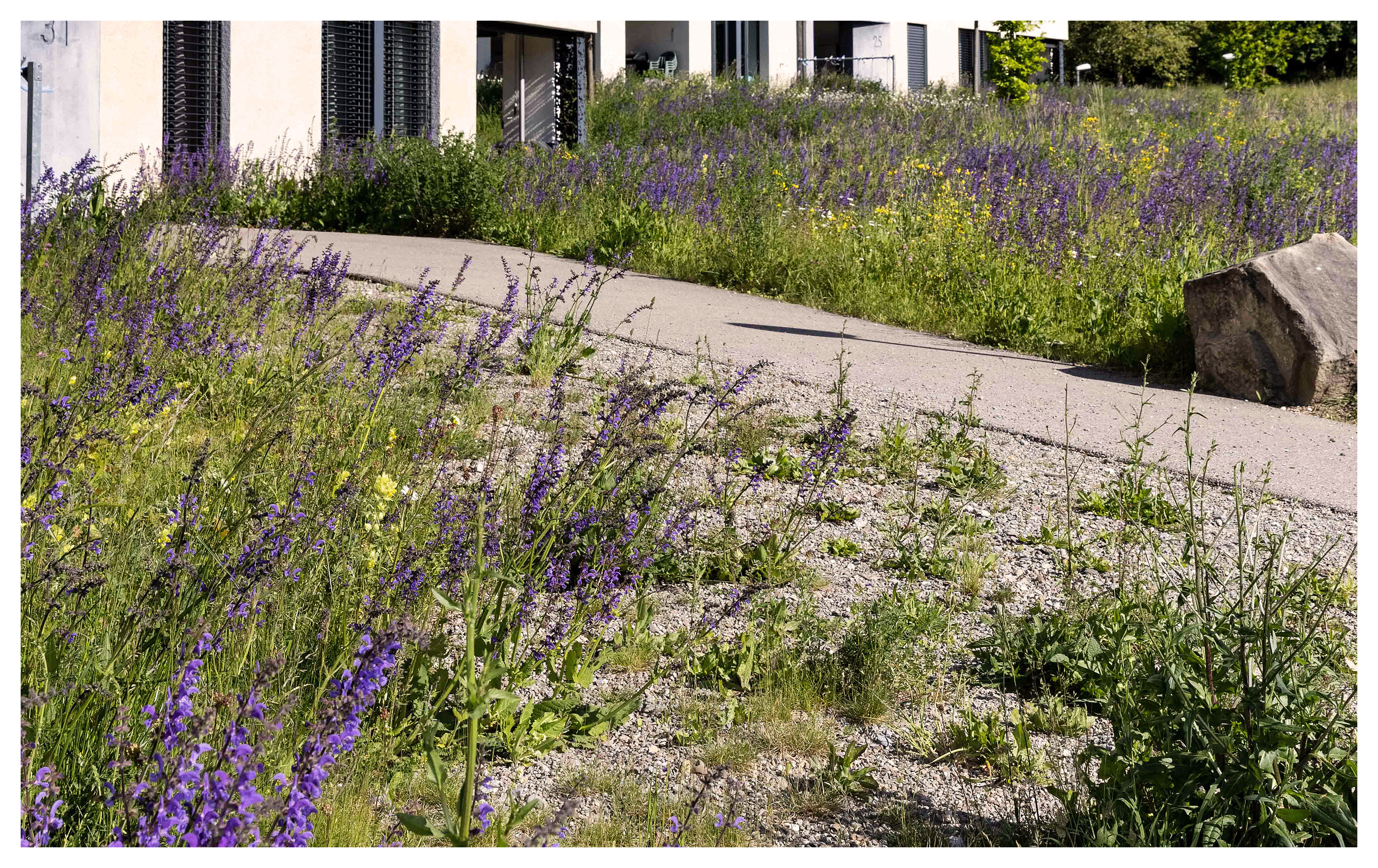 Schotterrasen sind begrünte, versickerungsfähige Beläge, die aus einer Mischung aus Schotter, Kies und organischem Material bestehen. Ihre lockere Vegetationsdecke mit niedrig wachsenden Gräsern, Kräutern und Stauden weist eine hohe Trockenheitstoleranz auf.