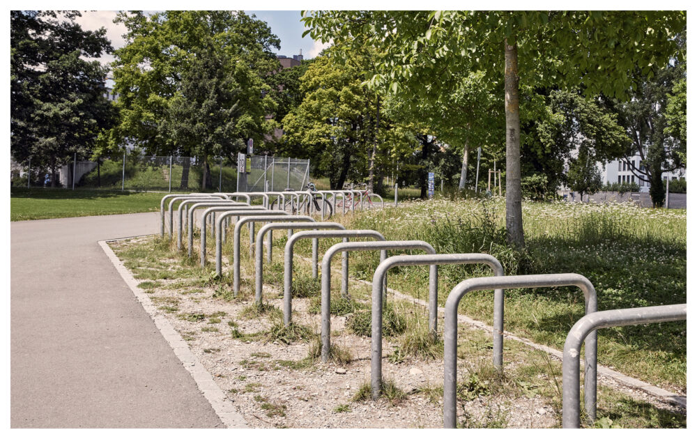 Die «Markierung» von Parkplatz-Stellflächen kann durch natürliche Elemente und Kleinstrukturen (z.B. grosse Steine, pflanzliche Trenn- und Leitlinien, Totholzstämme) erfolgen. [2]